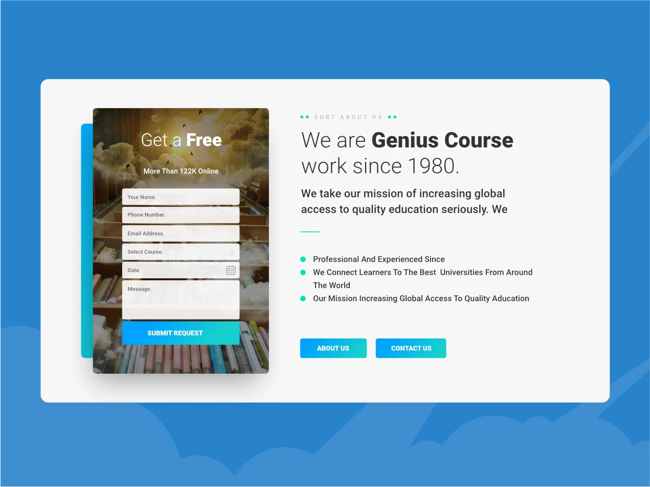 Genius – Learning & Course adalah template dengan desain modern, bersih, dan profesional yang dapat digunakan untuk kursus, pelatihan, acara, sistem pembelajaran online, dan website-website terkait pendidikan lainnya. Template buat khusus untuk aplikasi Sketch, XD, Adobe Photoshop, Adobe Illustrator, dan Figma. .